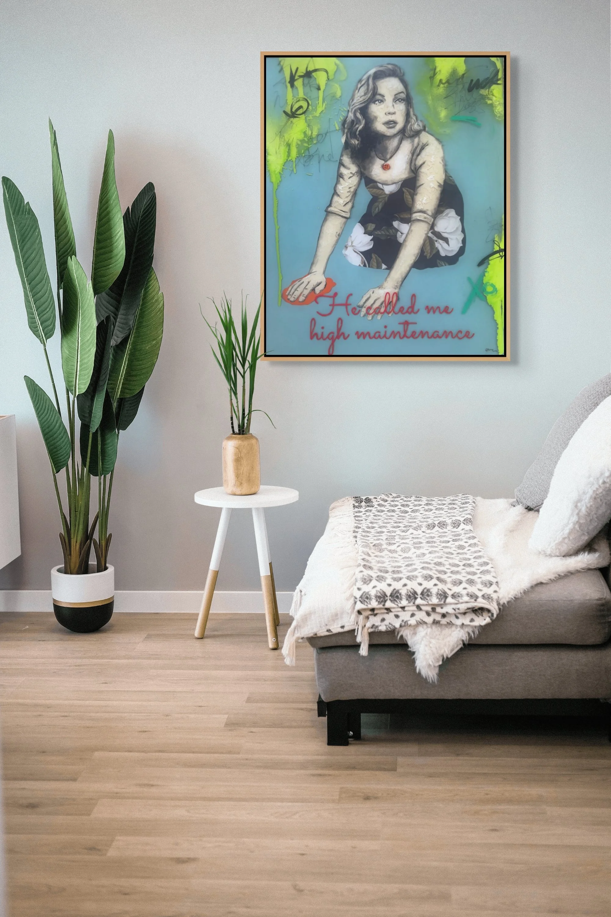 He Called Me High Maintenance examines the language used to define and dismiss. The work balances humor with critique, where a familiar phrase becomes a site of tension.