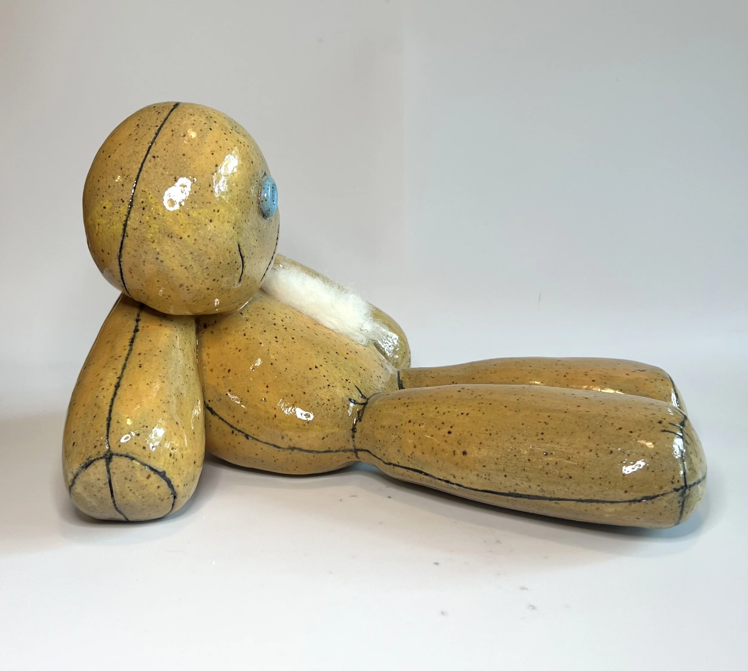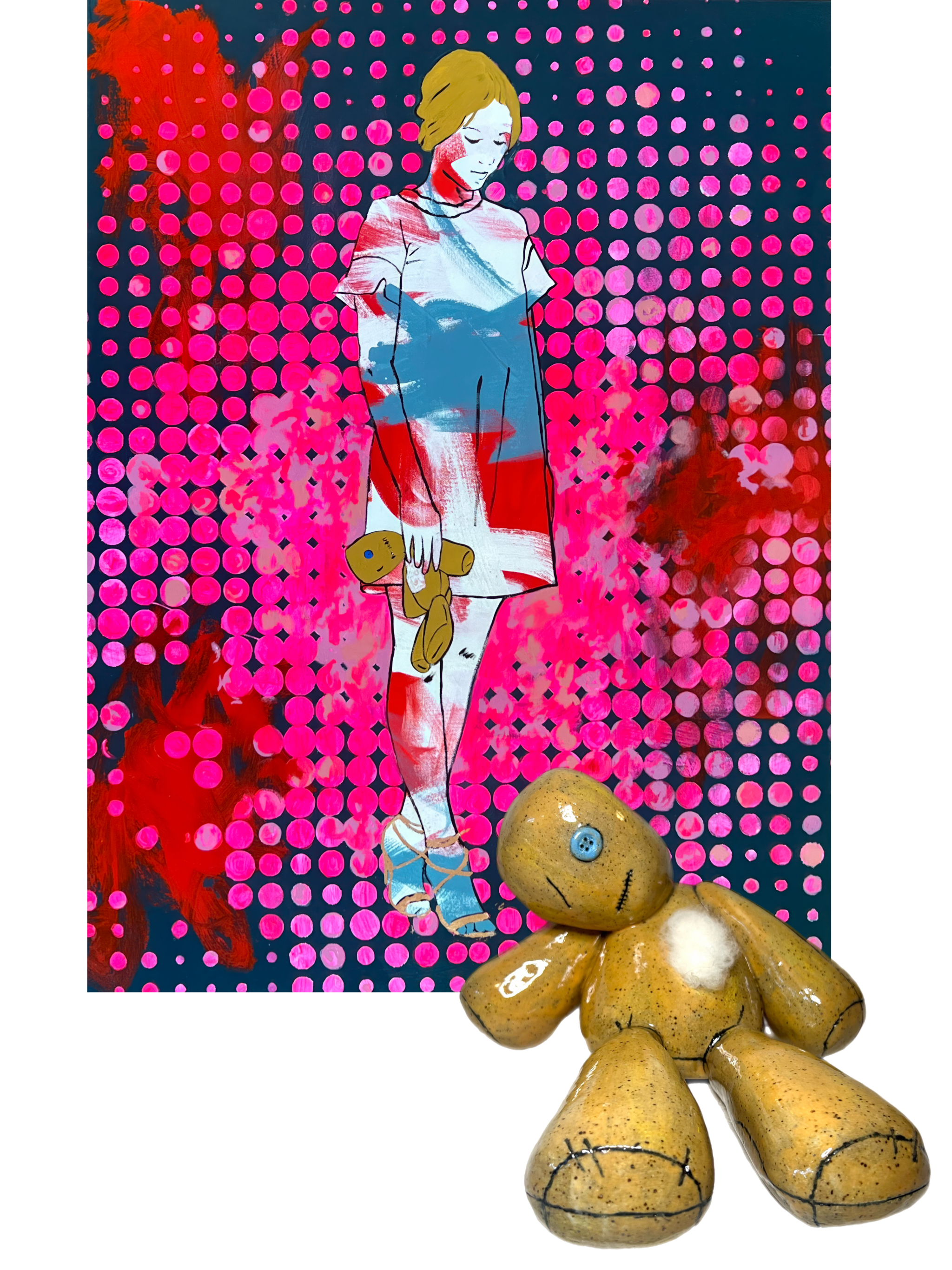 I had wanted to make Little Dude for awhile. It wasn’t enough to paint him (in “Falling Away from Me”) - I needed a more tactile experience. Korn’s Issue’s album has been my unofficial music theme for my college years- years of learning, discovering, messing up…. it embodies that time for me. The image of the simple doll, beat up, stuffing coming out presents so many narratives for so many. For me, it was the time and space I still felt like a kid, was supposed to act like an adult- but kept messing up, was so unsure about virtually everything in my life.