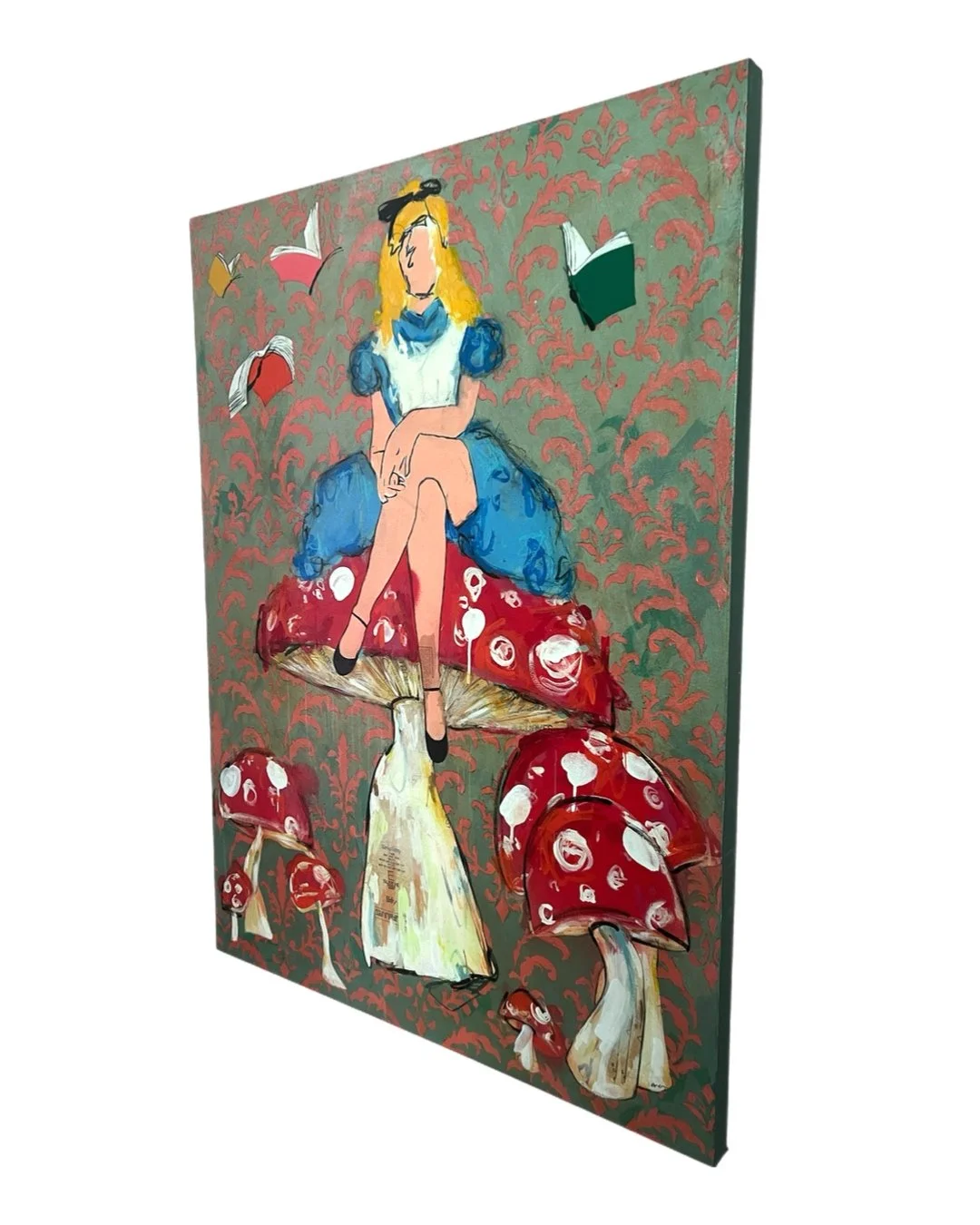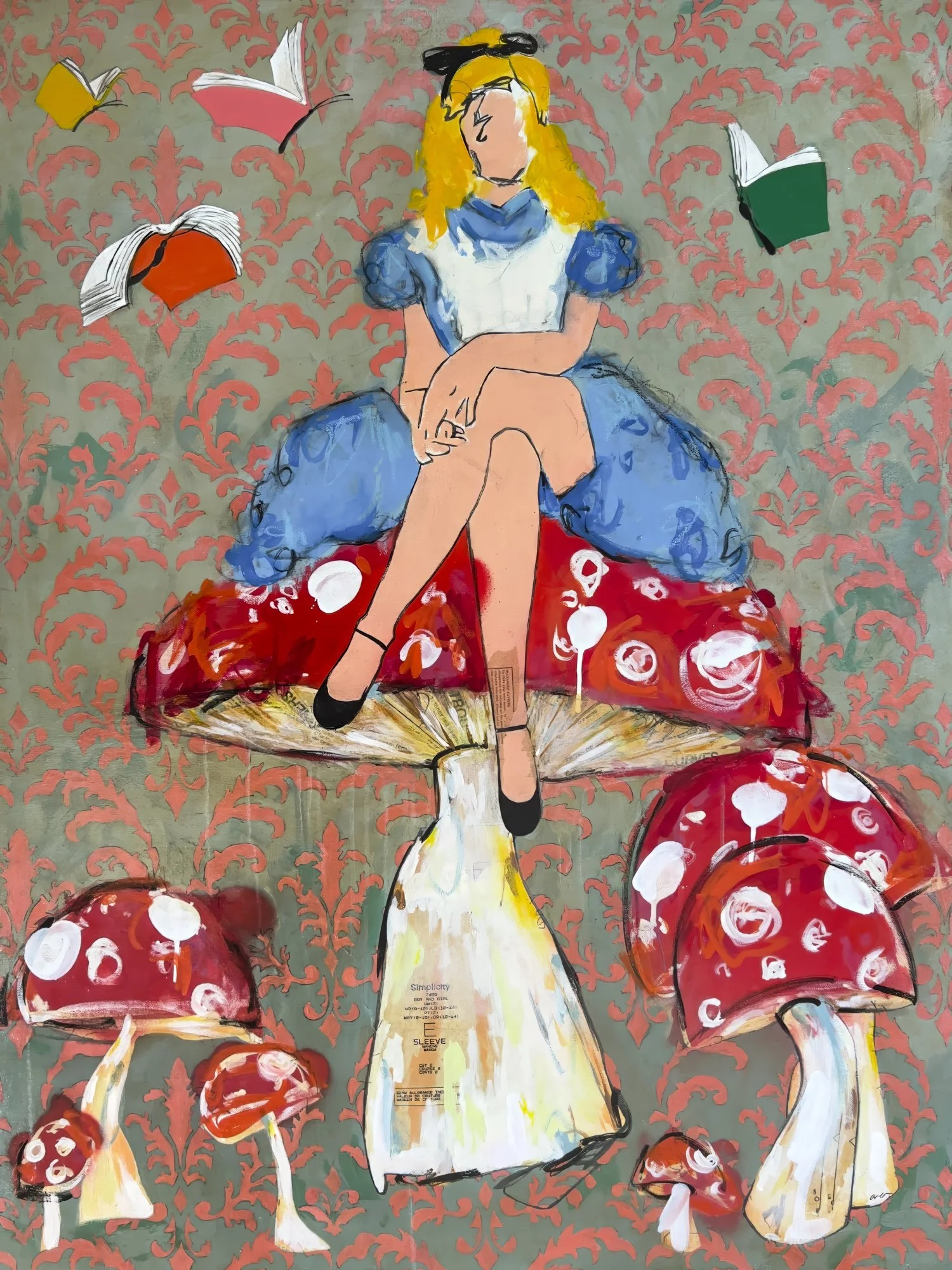 Waiting in Wonderland places the figure within a stylized, surreal environment. The work balances fantasy with introspection, where the setting amplifies a sense of suspension. Painted and layered elements create depth while maintaining a constructed surface. The figure exists between narrative and stillness.